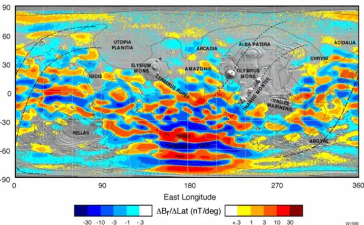 △火星全球探勘者号(MGS)在400公里高处获取的火星壳层磁场分布,火星剩磁有着明显的南北不对称性,主要分布在南半球。来源:参考文献 [14]