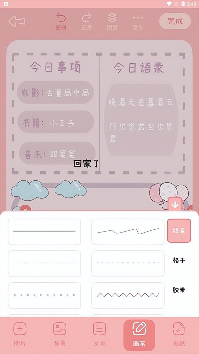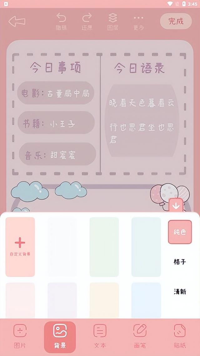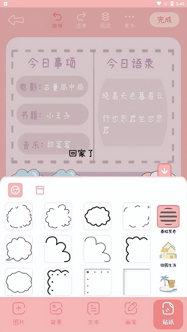 9、在手账的制作页面,可以点击图片、背景、文本、画笔、贴纸等功能进行使用。