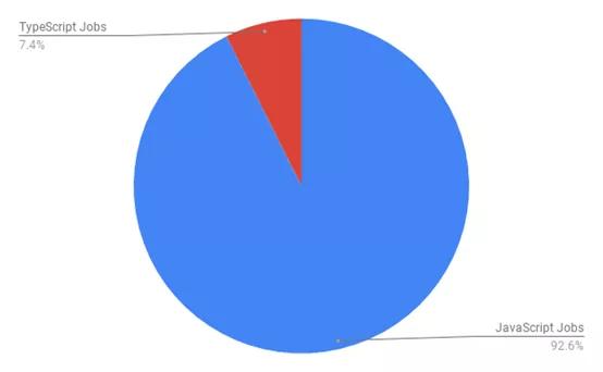 虽然人们的兴趣十分浓厚,使用率似乎也在快速增长,但是职位市场对TypeScript的使用经验尚未有强烈的需求。只有约7%的JavaScript职位空缺在职位描述中提及TypeScript(来源)。在人事经理的期望中,JavaScript开发人员能够轻松使用TypeScript,所以他们有可能不会在职位启事中提到TypeScript,这就导致了该数字可能偏低。