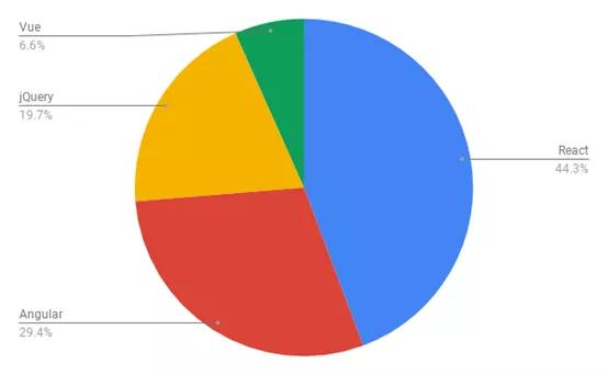 与去年相比,React增强了领先优势,而Angular和jQuery都丧失了和Vue竞争的优势。以下是一张饼状图,展示了各框架的相对就业市场份额情况: