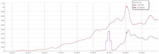 比特币和以太坊区块链的每日活跃地址情况(来源)