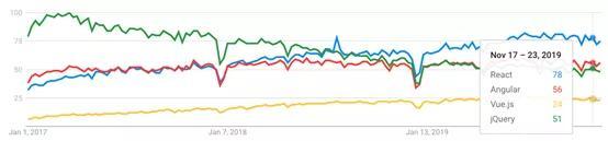 与职位公告一样,React有很大的领先优势,吸引了前端框架36%的搜索量,紧随其后的是Angular(大约27%)和jQuery(25%)。对Vue.js的搜索兴趣要比它占有的职位市场份额大得多,但该数据在排名方面一般与职位市场数据一致。这一点看来已经被成功证实。
