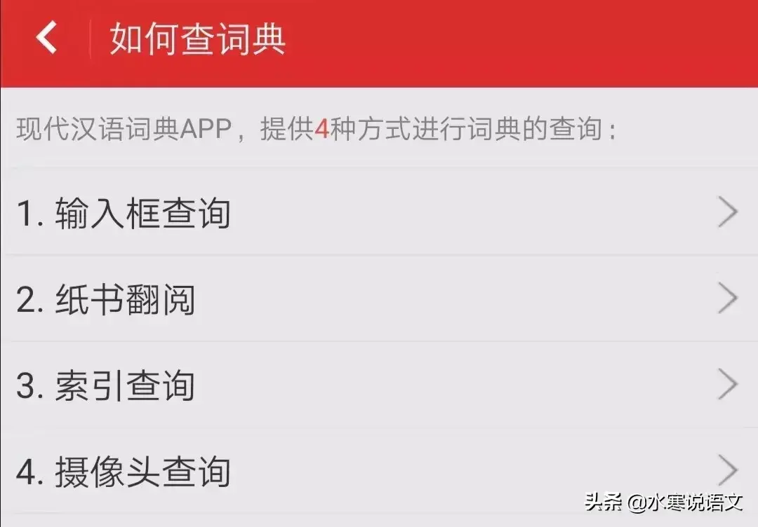 这个APP提供了四种查询方式:输入框查询,纸书查询,索引查询,摄像头查询。点击相关单界面中的每一种查询方式,对其功能有明确的介绍。查看相关介绍的路径如下图所示。