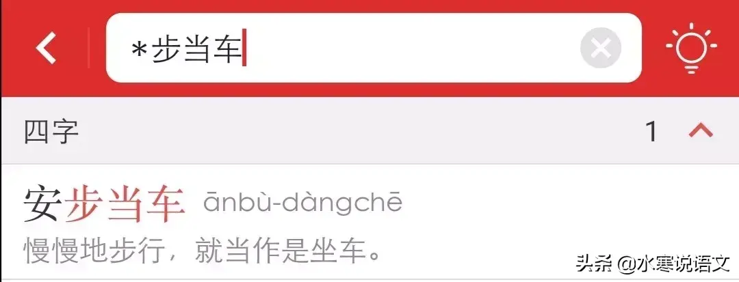 比如,“安步当车”这样一个词语,假如我们不能确定该词语的第一个字是“安”还是“按”,甚至不能确定第一个字是什么时,搜索“*步当车”,就能找到这个词语。这要比纸质词典方便快捷得多。