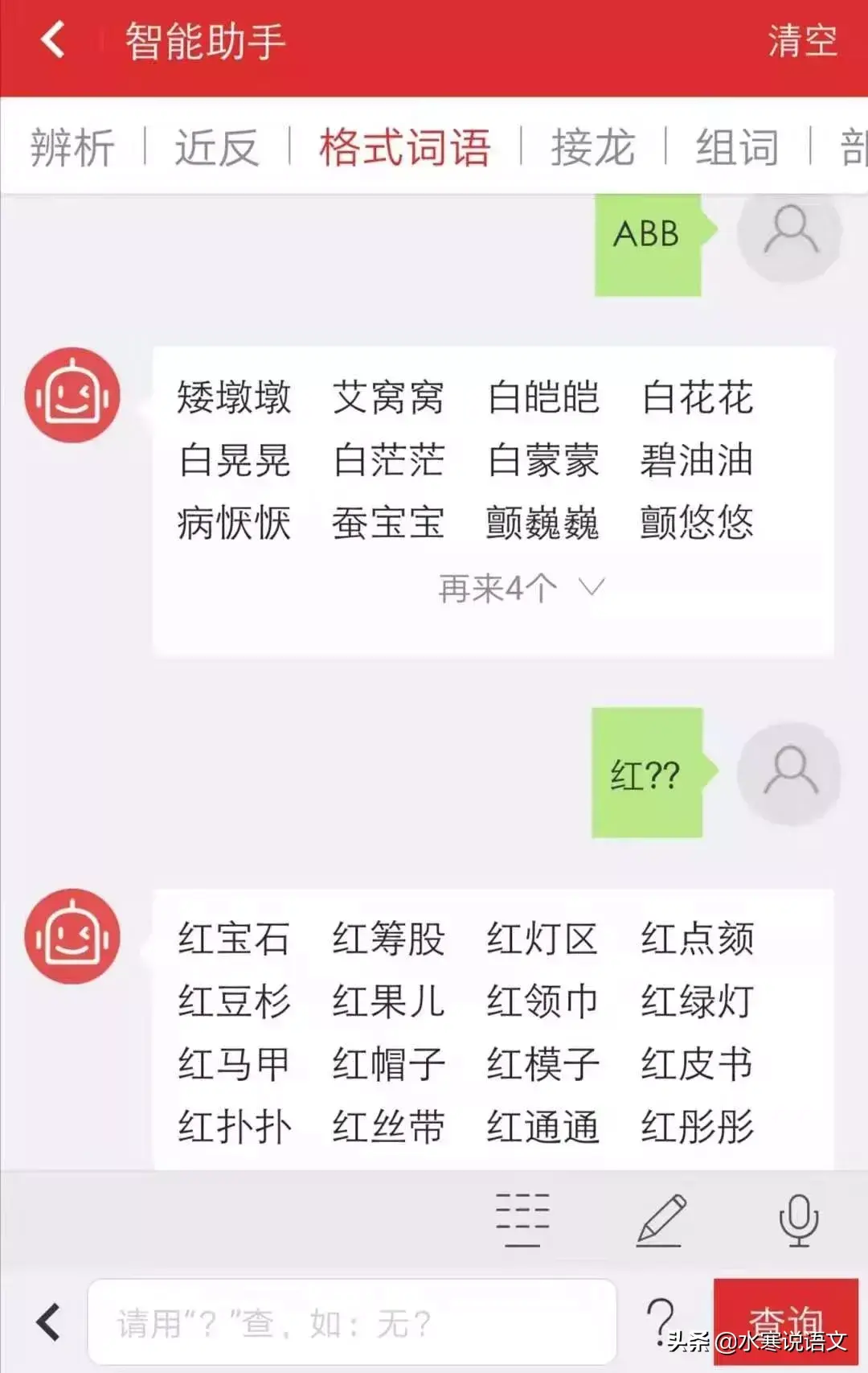 如果孩子想让你帮助查找AAB、ABA、ABB、AABB形式的词语,那只要点击“固定格式词语”就可以了。还可以按关键字查询,例如,以“红”字组成的ABB形词语,只要在搜素框中输入“红??”,就可以查到带有“红”字的三字词语,其中就有“红彤彤”“红通通”“红扑扑”“红艳艳”等以“红”字开头的ABB形词语。