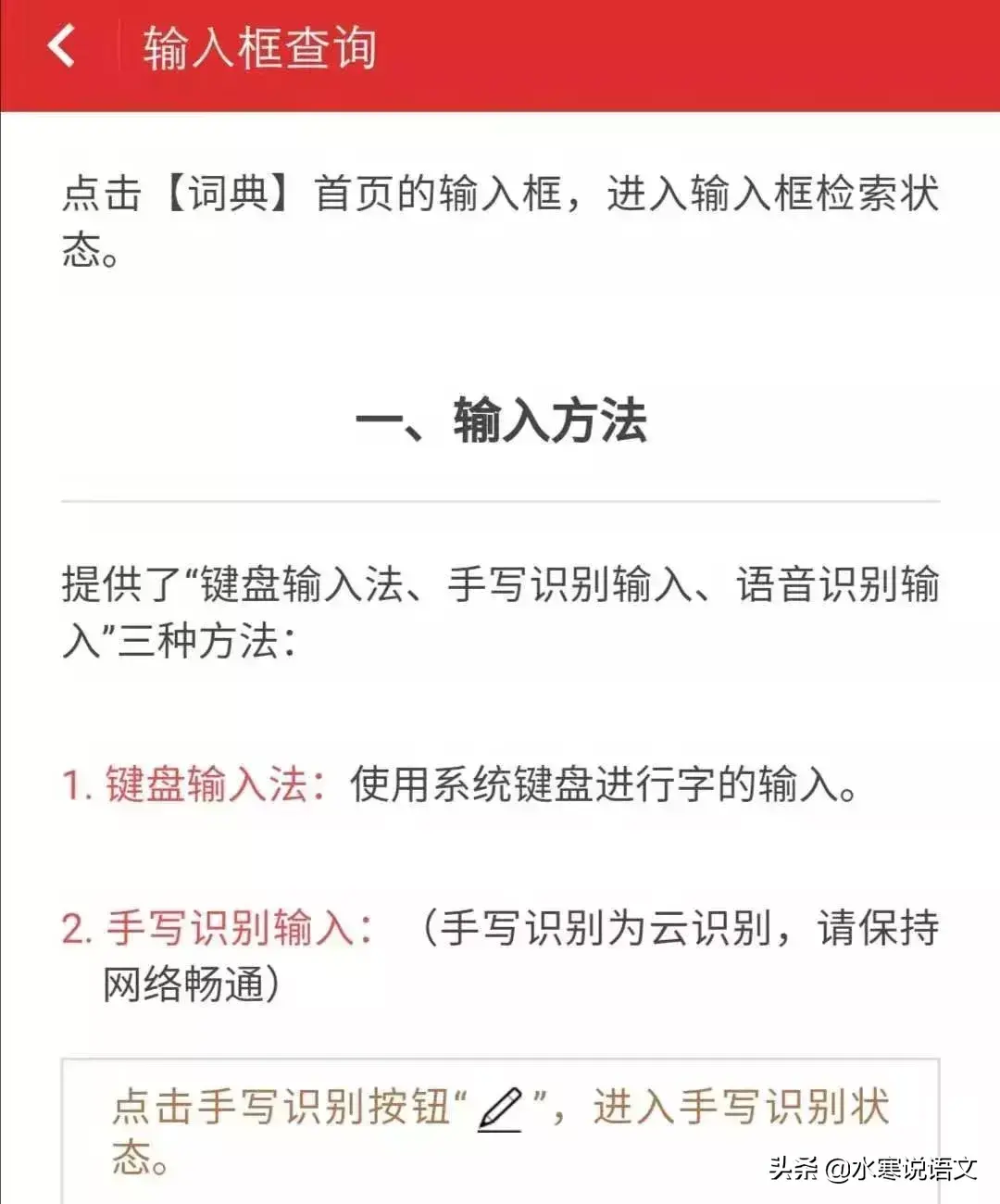 而且,输入搜索关键字词时,可以采用键盘输入,手写识别输入,语音识别输入,甚至拍照输入等方式,比如,有某一个字词读音甚至部首都不能很确定时,就可以采用手写输入或者拍照输入方式找到该字词。