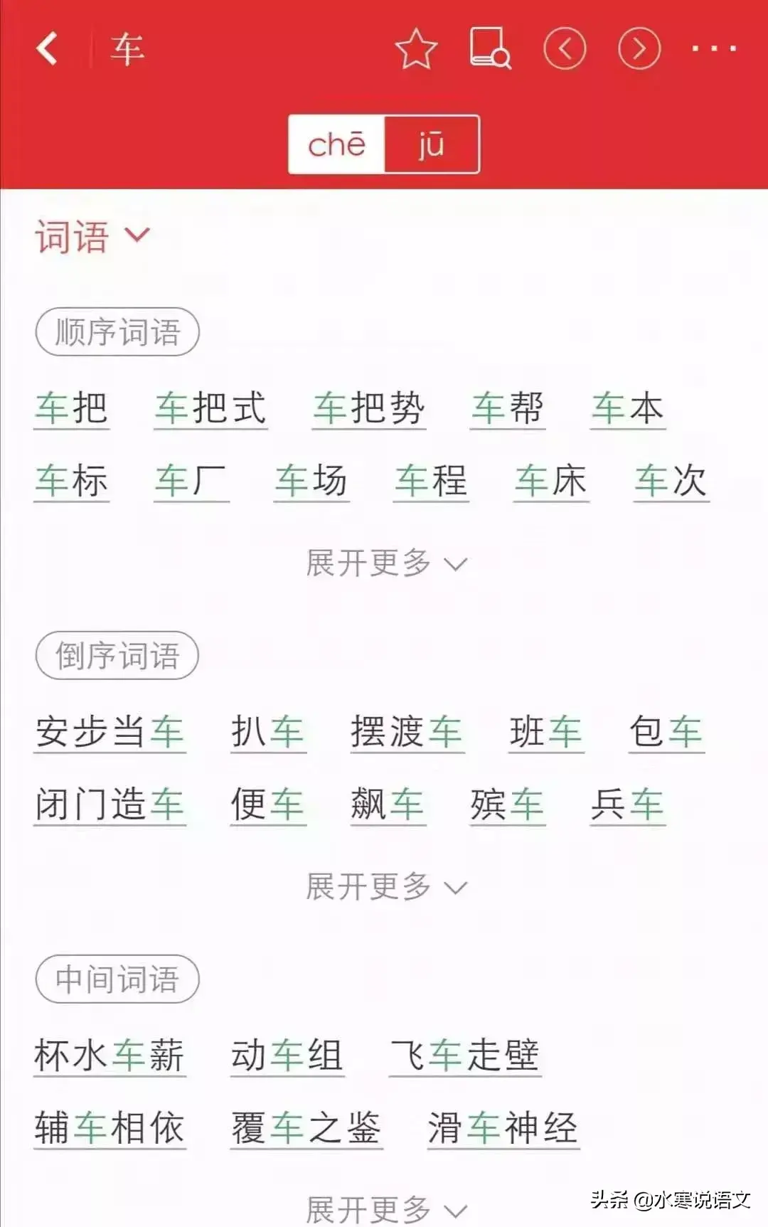 与此相类,在单个字的解释界面下面,还提供了利用该字组词的顺序词语,倒序词语甚至中间词语。以“车”字为例,如果纸质字典,我们查“车把”“车标”之类,还可以在“车”字这个字头下查找,但要找“车”在中间或者在末尾的词语,就要重新翻查,而这个APP提供了常见的带有某字的词语,想看哪一个词语,直接点击就可以看到详细解释,非常方便,大幅度提高了检索效率。