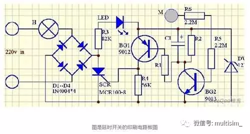 这里介绍一个简单实用的触摸延时开关电路,它具有简单、廉价、性能好等特点,很适合爱好者自行制作。电路原理:延迟开关电路见图D1—D1,SCR组成开关的主回路,BG1,BG2等组成开关的控制回路。平时,BG1,BG2均处于截止状态,SCR阻断,电灯H不亮。此时220V交流电经D1--D4整流、R3和DW使LED发光,用作夜间指示开关位置。这时流过H的电流仅2mA左右,不足使电灯H发光。需要开灯时,只有用手指摸一下电极片M,因人体泄露电流经R5,R6注入BG2的基极,BG2迅速导通。BG2集电极为低电平,BG1也随之导通,因此有触发电流经BG1注入SCR的控制极使SCR开通,电灯H就通电发光。在BG2导通瞬间,C1通过BG2的c-e极间被并联在DW的两端,因此被迅速充上约12V左右的电压。电灯点亮后,人手离开M,虽然BG2恢复截止状态但由于C1所存储的电荷通过R1向BG1发射结放电,使BG1依然保持导通状态,所以电灯继续发亮。当C1电荷基本放完后,BG1恢复截止态,SCR失去触发电流,当交流电过零时,SCR关断,电灯熄灭。开关延迟时间主要由电阻R1,R2和电容C1的数值决定,下面提供一组实验数据供大家参考。如要进一步增大延时时间,可加大C1容量。除上述主要因素外,BG1的放大倍数以及SCR的触发灵敏度对延时时间也有影响。注意:本电路与市电直接相接,在调试过程中要十分注意,以免触电。有条件的朋友,可以先用隔离变压器把市电隔离,再进行调试。电阻R6的引线要短,一头直接焊在电极片M的背面,另一头焊上一跟软线,再接到印板上的R5。采用两个高阻值电阻的目的是为了确保使用者的绝对安全。