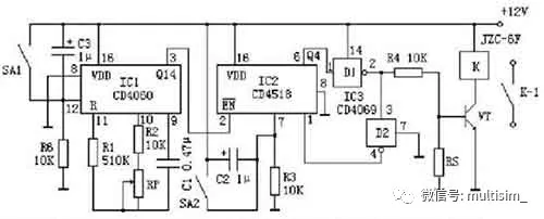 该电路由CD4060 组成定时器的时基电路,由电路产生的定时时基脉冲,通过内部分频器分频后输出时基信号。在通过外设的分频电路分频,取得所需要的定时控制时间。通电后,时基振荡器震荡经过分频后向外输出时基信号。作为分频器的IC2 开始计数分 频。当计数到10 时,Q4 输出高电平,该高电平经D1 反相变为低电平使VT 截止,继电器 断电释放,切断被控电路工作电源。与此同时, D1 输出饿低电平经D2 反相为高电平后加 至IC2 的CP 端,使输出端输出的高电平保持。电路通电使IC1、IC2 复位后,IC2 的四个输出端,均为低电平。而Q4 输出的低电平经 D1 反相变为高电平,通过R4 使VT 导通,继电器通电吸和。这种工作状态为开机接通、定 时断开状态。