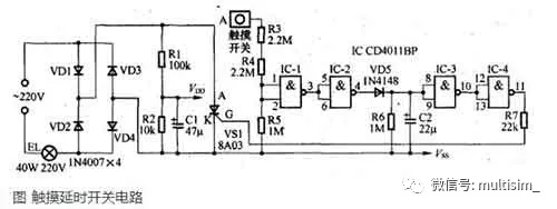 图中为触摸延时开关实验电路。它由整流二极管VD1~VD4组成全波桥式整流电路,作为集成电路工作电源,四2输入端与非门4011、单向晶闸管VS1等组成触摸开关电路。全波桥式整流电路输出高达200V脉动直流电,经过电阻器R1、R2分压,并通过电容器C1滤波,输出约13V的直流电,作为IC工作电源。在照明灯EL亮时,4011稳态工作总电流不到20μA,灯熄灭时401l电流(用50μA量程)几乎无法测出,足见CMOS集成电路的低功耗。此外,在照明灯EL点亮时,R2分压降至2V,4011仍能工作,这就是选用CMOS数字集成电路的原因。当用手触摸金属片A端时,通过降压电阻器R3、R4将感应交流电信号加在IC—1输入端,在交流电正半周时,IC-1的l、2脚为高电平,其输出端下跌为低电平,与之相连IC-2输出端4脚上升为高电平,通过开关二极管VD5向定时电容器C2充电,使得IC-3输入端上升到高电平,其输出端10脚为低电平,IC-4输出端11脚为高电平,通过电阻器R7加在单向晶闸管控制电极G上,触发VS1导通,负载照明灯EL点亮。当C2充电电荷通过定时电阻器R6逐渐放电,使电压下降到低于CMOS门开启电压时,IC-3输出端上升为高电平,IC-4输出端为低电平,单向晶闸管阻断,EL熄灭。当R6为1MΩ、C2为10μF时,触摸开关控制延时约17s,C2换成22μF时,延时增加一倍,C2为47μF延时已绰绰有余。在触摸开关电路中,R5为下拉电阻器,尽管其电阻值为1MΩ,但与非门IC-1输入端为低电平,说明CMOS数字集成电路输入阻抗非常高。四2输入端与非门4011剩余的输入端不能悬空,采用并接方式,当作非门使用。IC也可选用四2输入端或非门4001。