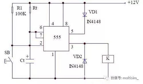 详细电路工作原理解析:555构成的简易长延时电路当按下按钮SB 时,12V 的电源通过电阻器Rt 向电容器Ct 充电,使得6 脚的电位不断升高,当6 脚的电位升到5 脚的电位时,电路复位定时结束。由于在5 脚串上了一个二极管VD1 使得5 脚电位上升,因此比一般接法(悬空或通过小电容接地)具有了更长时间的定时。