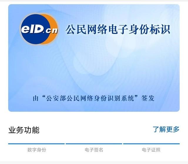 eID是由公安部公民网络身份识别系统签发的公民网络电子身份标识,以密码技术为基础、以智能安全芯片为载体,能在不泄露身份信息的前提下在线远程识别身份,提供数字身份、电子签名、电子证照等业务功能。