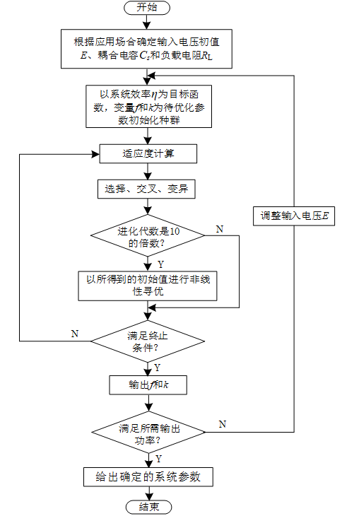 本文将自适应遗传算法与非线性规划相结合对系统进行优化,使算法能够快速找到全局最优解。系统参数设计与优化流程图如图3所示,图中E根据实际应用中所需功率等级而定,Cs根据实际应用中所需的传输距离和空间尺度而定,RL由实际应用中的供电对象决定。