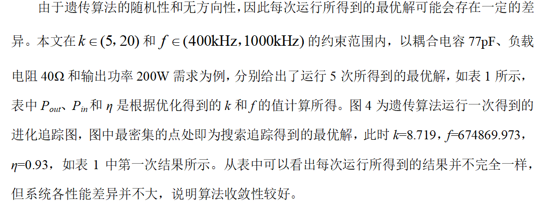 本文针对EC-WPT系统的多约束条件下系统参数优化问题,在双侧LC型EC-WPT系统和LCC谐振网络参数配置方法的研究基础上,提出了一种结合非线性规划和自适应遗传算法的优化方法,以系统效率为目标函数,在多约束条件下对系统频率f和并联谐振电容与耦合电容比值k进行寻优,最终使系统在满足所需功率的条件下效率最高,也解决了系统ZPA、低激励电压、小补偿电感和传输距离之间相互制约的问题。