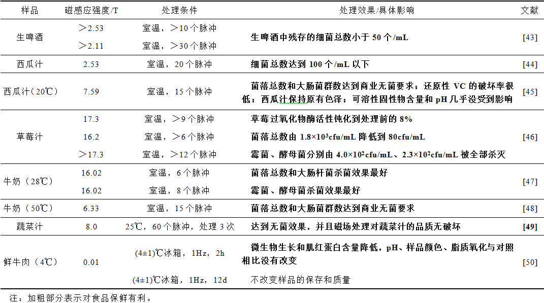 目前,也有多项研究表明,脉冲磁场(Pulsed Magnetic Field, PMF)可以通过其杀菌作用,使食品品质得到更好的保存,脉冲磁场与食品保鲜研究见表3。