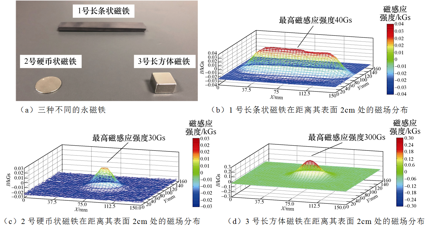 三种磁铁的表面磁感应强度分别为70~363Gs、279~643Gs和4171~4671Gs;在距离其磁铁表面0.5cm时,其电场强度分别降到了50~250Gs、120~300Gs和1200~3000Gs;在距离其磁铁表面2cm时,其电场强度分别降到了20~40Gs、10~20Gs和120~300Gs,其空间磁场分布差别十分显著。