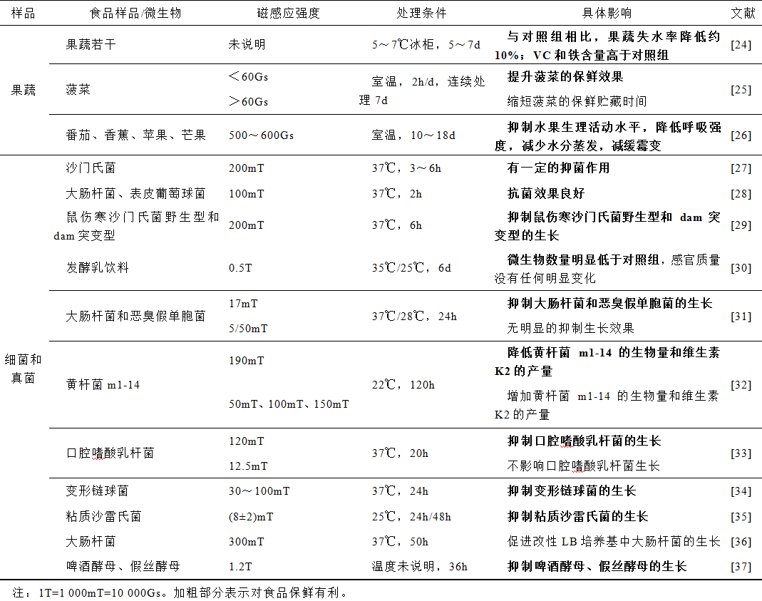 目前已有多项研究表明,一定参数的静磁场(Static Magnetic Field, SMF)能够对一些食品起到促进保鲜的效果,并且多项研究表明,静磁场能够抑制多种细菌的生长,从而有利于保持食品的新鲜度和品质,静磁场与食品保鲜研究见表1。