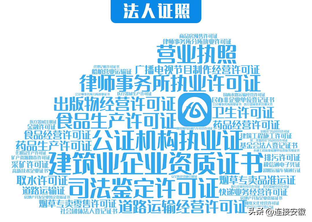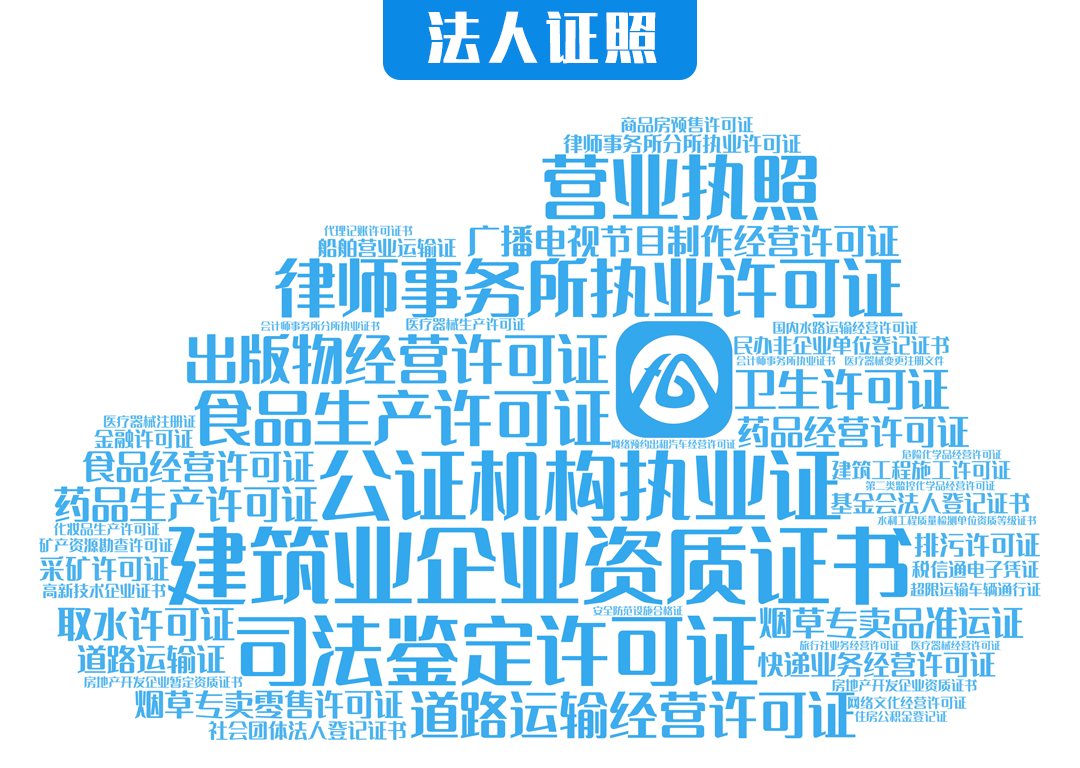 法人证照51项,例如:营业执照、建筑业企业资质证书、律师事务所执业许可证等。