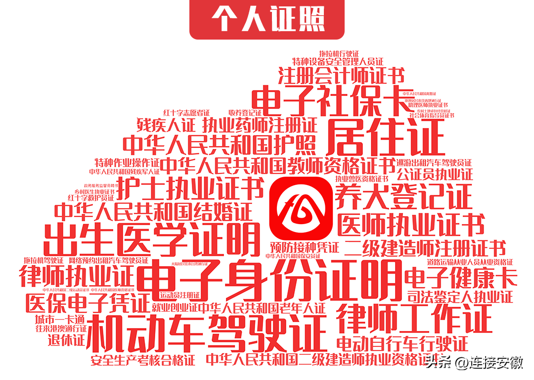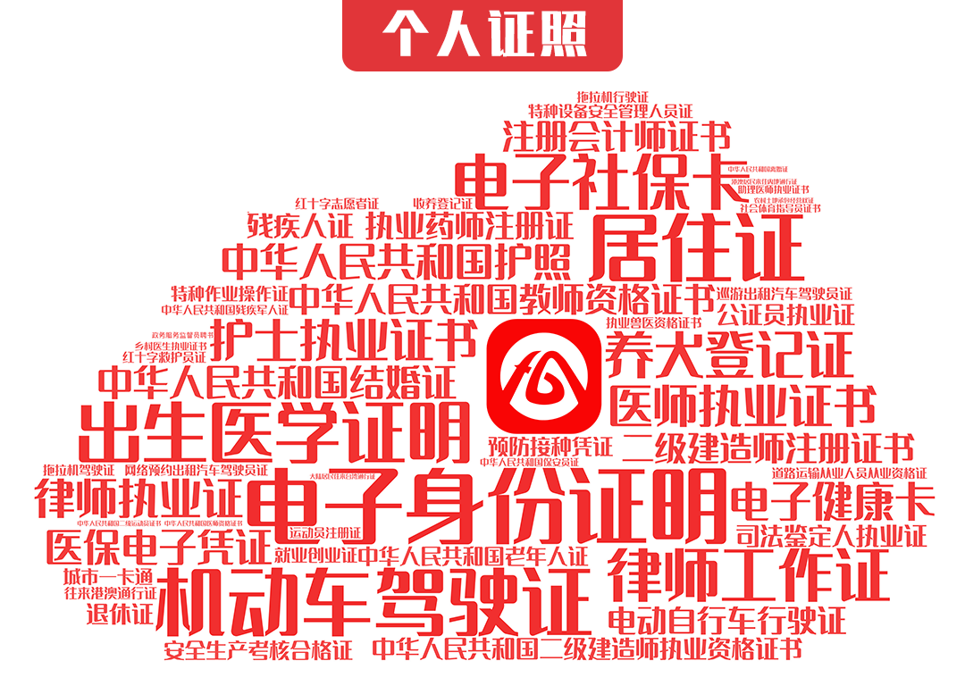 1 其中,个人证照55项,例如:电子身份证明、机动车驾驶证、电子社保卡等。此外,还有通用证照(个人+法人)8项,