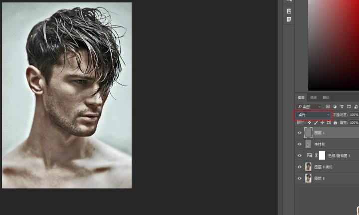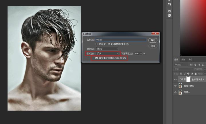4、新建中性灰图层,用黑色画笔在模特较深处涂抹,用白色画笔在高光涂抹;这里画笔一定要降低透明度和流量,还要灵活变动数值,这个自己靠感觉把握吧!涂抹好之后改图层混合模式为柔光