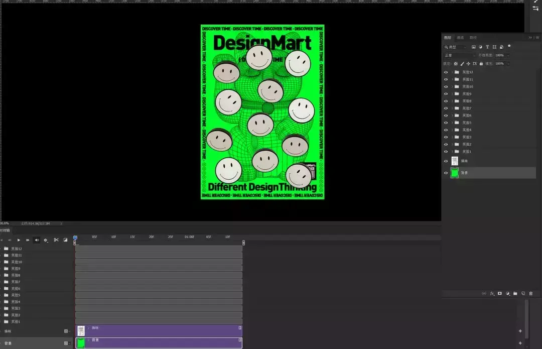 先准备好动态元素,我们可以在PS中先处理好这些动效,帧数,背景等等,其中最重要的一步,一定要把GIF动图里的所有图层群组!之后直接将整个群组拖进画面中!