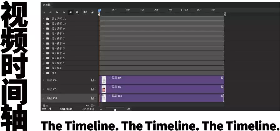 视频时间轴工具是PS中时间轴的另一个用法,它可以同时处理多个动态效果, 点击右下角的“转换为视频时间轴”即可进入界面,在这个界面中,我们可以将编排好的图层独立处理。