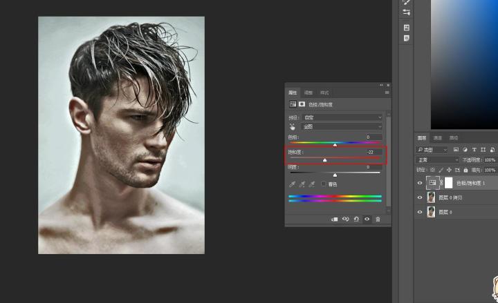 3、打开色相饱和度,降低饱和度,如果有些地方你不想调整可以用蒙版黑色画笔涂抹回来
