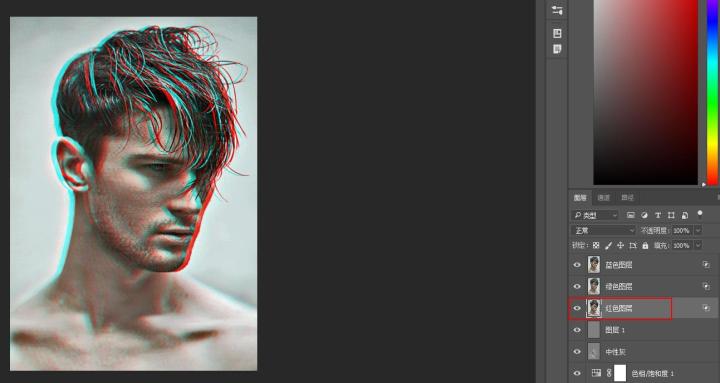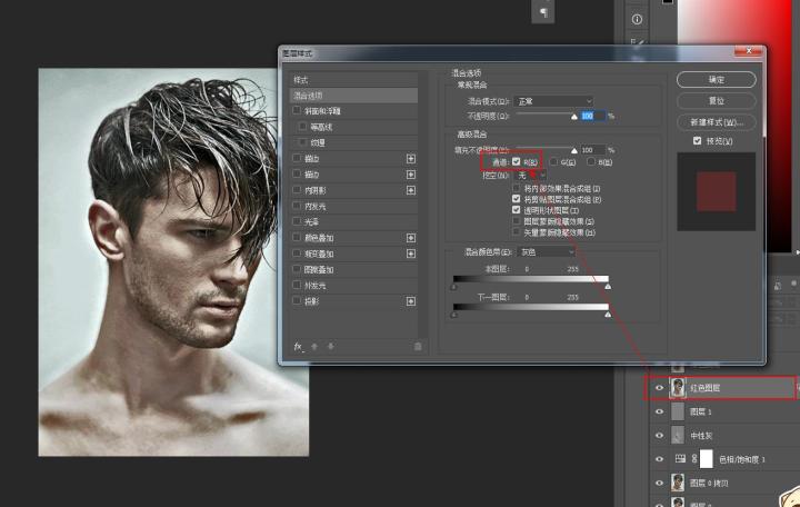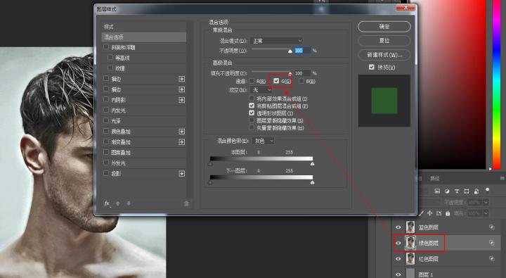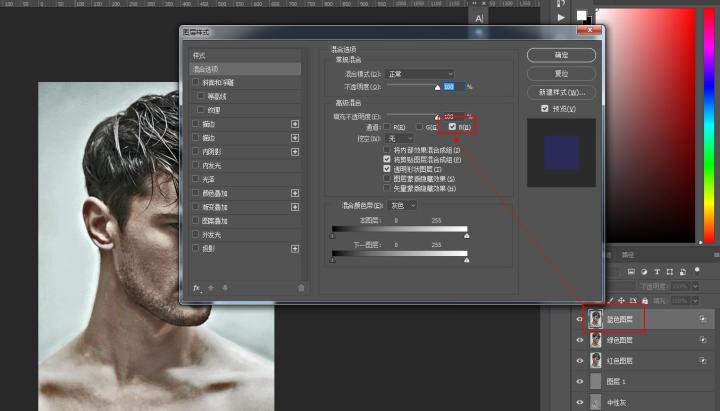 6、这个抖音画面很容易出效果。首先盖印图层;然后,选中图层后连续2次复制(快捷键:Ctrl+J),然后分别命名图层为红色图层、绿色图层、蓝色图层;再双击分别双击每个图层设置图层样式中的混合选项,在通道分别只勾选红、绿、蓝