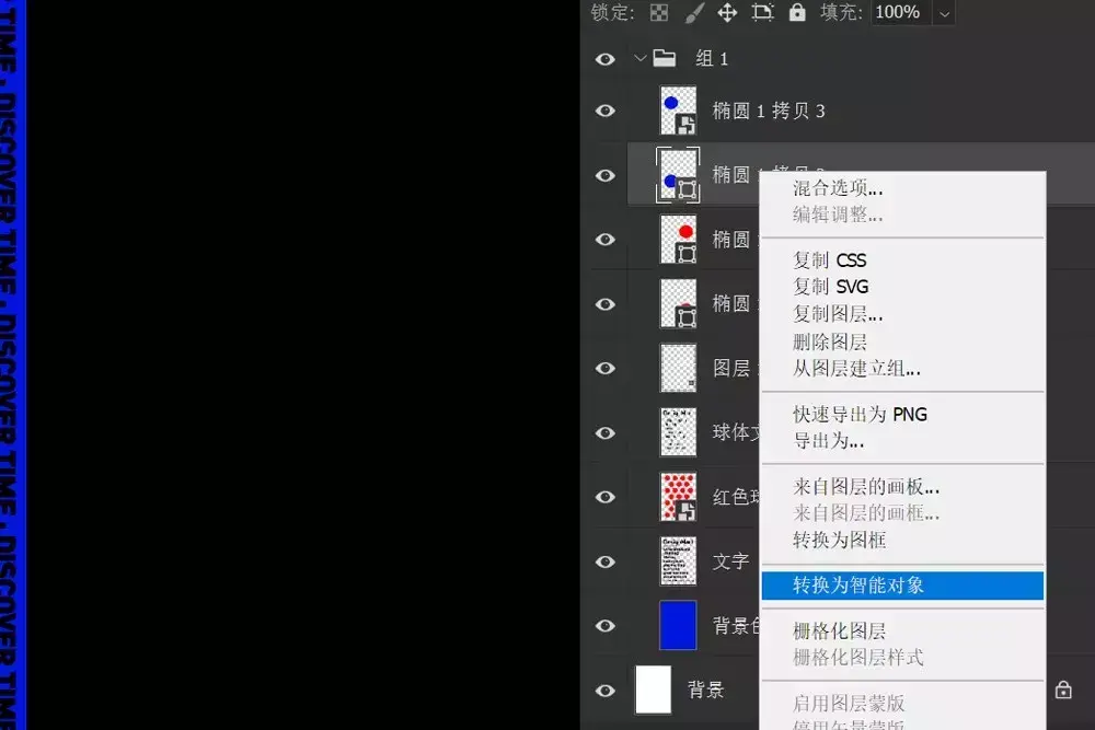 由于关键帧只能识别智能对象的大小变化,所以我们需要将这个圆形分别转换为智能对象。