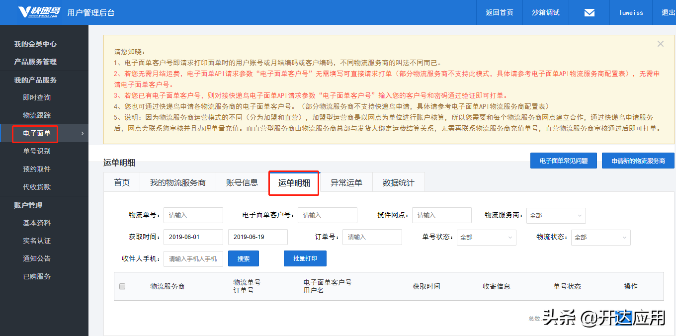 也可以去快递鸟官网-->用户管理后台-->电子面单-->运单明细查