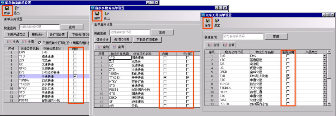 打开公用设置-物流面单设置-菜鸟物流面单设置/京东无界面单设置/拼多多物流面单设置,选择物流公司,勾选【启用】 (拼多多物流面单需同时勾选【云打印】),点击【保存】 ,即可启用该物流公司的电子面单服务。