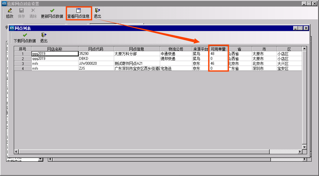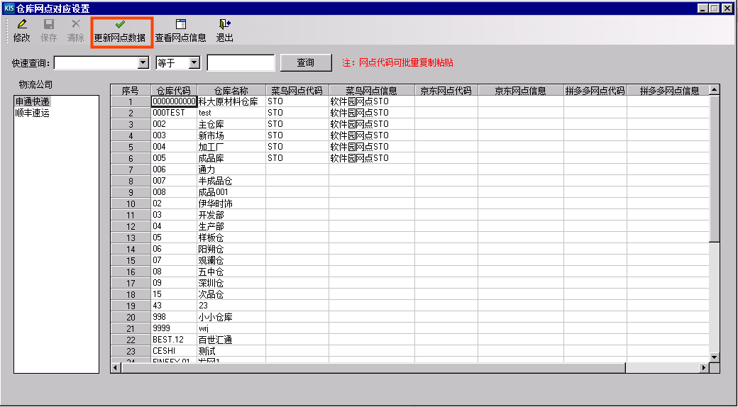 打开公共设置-物流面单设置-【仓库网点对应设置】 ,点击【更新网点数据】 ,系统会下载最新的网点信息和可用单量。