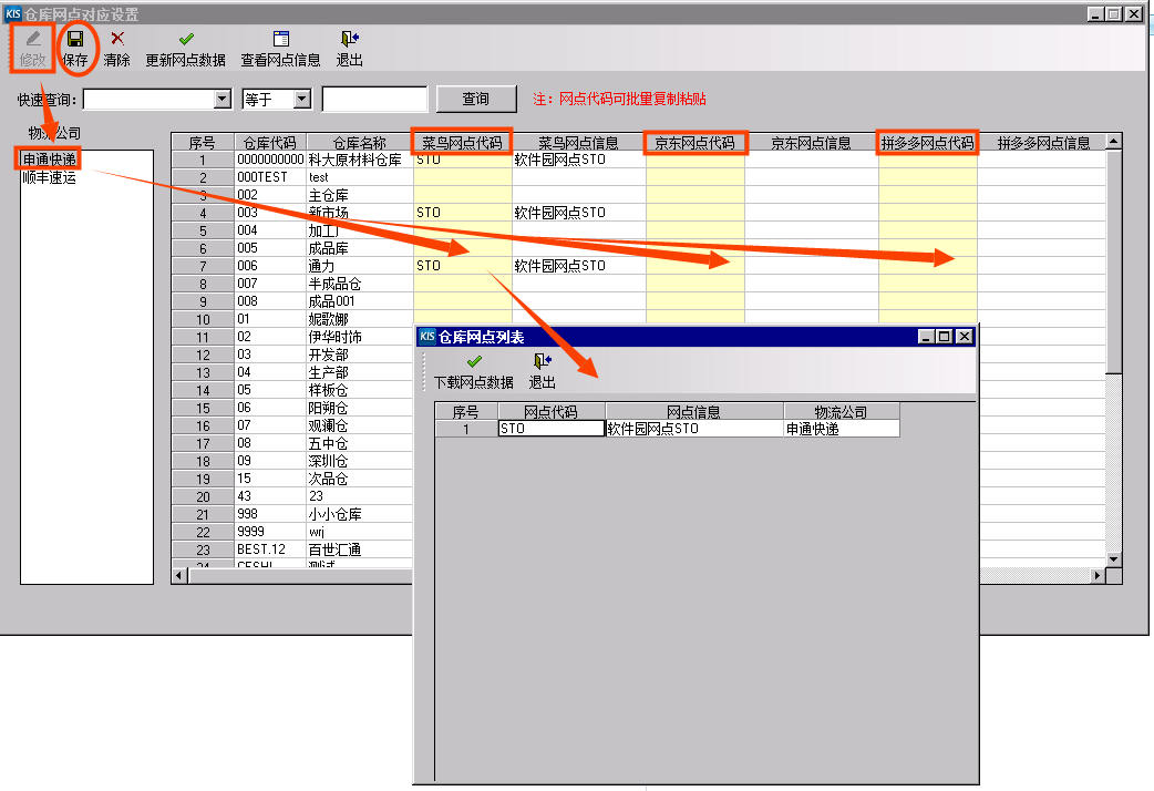 点击【修改】 按钮,选中物流公司,找到对应的仓库,在菜鸟/京东/拼多多网点代码列下,双击黄色区域选择网点信息,点击【保存】 按钮,保存上述设置。