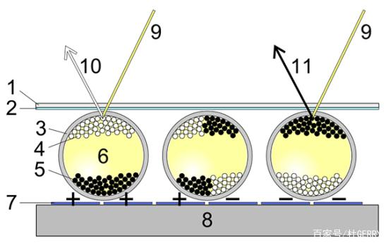 ⒈上层;⒉透明电极层;⒊透明微胶囊;⒋带正电荷的白色颜料;⒌带负电荷的黑色颜料;⒍透明液体(油);⒎电极像素层;⒏基板;⒐光线;⒑白色;⒒黑色