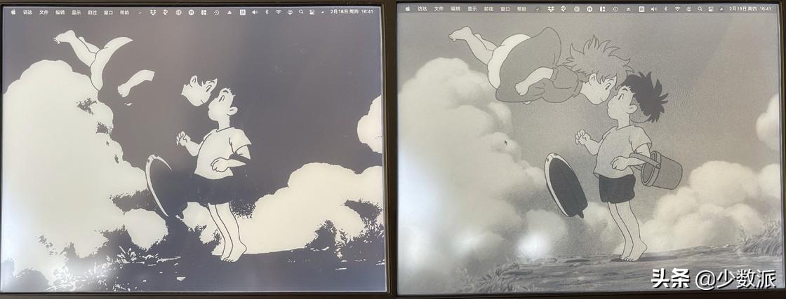 大上 Paperlike HD-FT 拥有 2K 分辨率(2200*1650),207 dpi,硬件本身能够达到的显示细腻程度其实还是挺高的,但搭配 Mac 显示静态画面时却无法发挥其最佳效果,原因在于:一是实际使用中不能选择 2200*1650 作为显示分辨率,字会小到根本看不见,所以只好设置到 1100*824,显示的细腻程度因此大打折扣。Windows 上可以选用原始分辨率,把字号设置成 200%,整体显示效果要比在苹果电脑上好很多。二是 macOS 的字体渲染在传统显示器上表现优异,但并未适配墨水屏,导致实际显示效果有些毛糙,看惯了视网膜屏幕再突然看这个会觉得难以适应。如果要打比方的话,很像小时候写过的那种油印卷子。尤其在与 Kindle 等同为墨水屏的设备比较时,Paperlike HD-FT 搭配 Mac 的效果远远不及对比对象们。