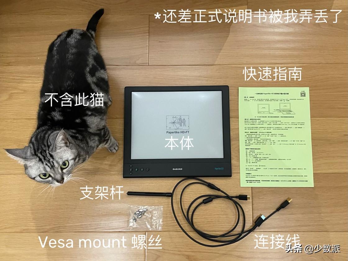 从盒子里把 Paperlike HD-FT 拿出来,我的第一感受是轻巧。Paperlike HD-FT 的实测重量为 794 克,只有一个屏幕,没有传统显示器的底座。作为一个 13.3 寸的显示器,它的造型更接近大屏电子书。大上 Paperlike HD-FT 的包装里只配了一根支杆及几颗 VESA 螺丝,你可以把它可以安装在 VESA 支架上,我则直接把它放在阅读架上使用。
