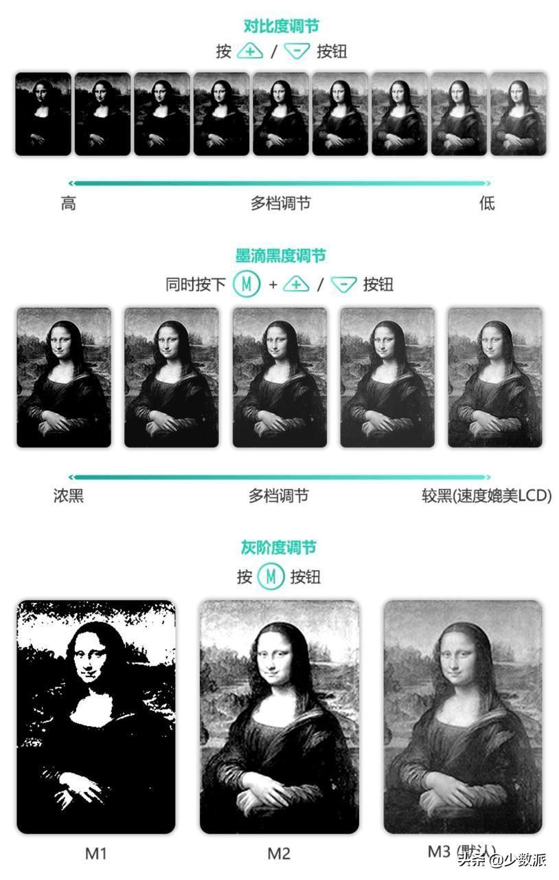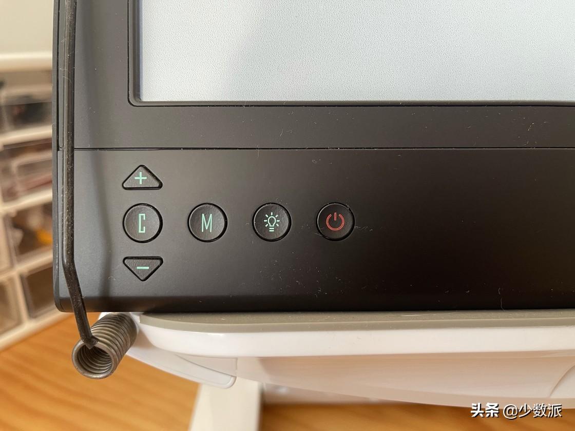 屏幕正面左下方有几个实体按键,分别用来手动刷新,调整对比度、墨滴黑度、灰阶、亮度与色温,还有一个开关键。总地来说,墨滴越黑,对比度越高,响应越慢。如果是长时间阅读静态文档,那么 Black++ 模式比较好,如果是编辑工作,那么 Fast+ 和 M3 的组合更快更顺手。