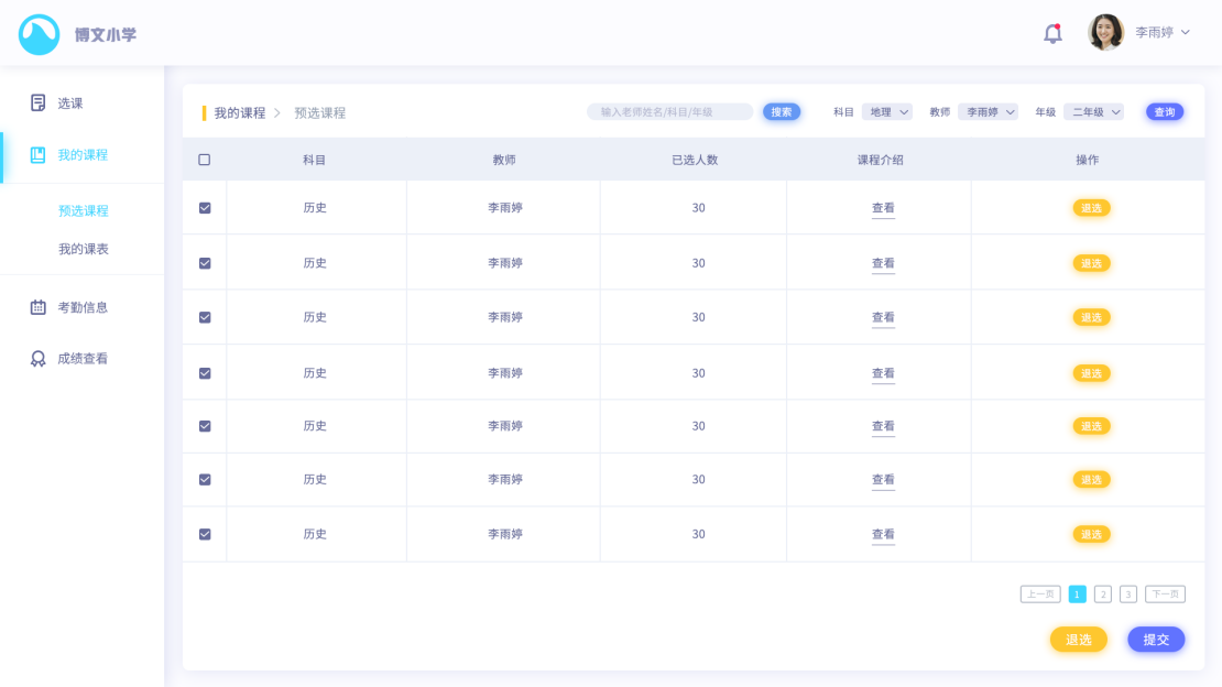 在选课操作完成时学生可以进行多维度的预选结果查看,确认提交后系统将自动校验选课冲突,当学生选课结果与设置规则发生冲突,系统将自动提醒操作有误。