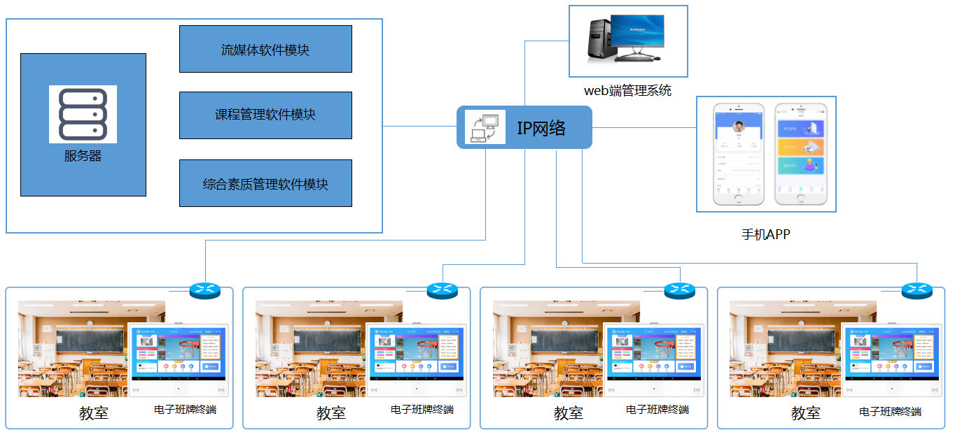 在中心机房建设一套服务器,包含流媒体软件模块、课程管理软件模块和综合素质管理软件模块,通过itc智慧班牌web管理系统,将实现学生走班选课、排课,综合素质评价系统两个子管理系统。