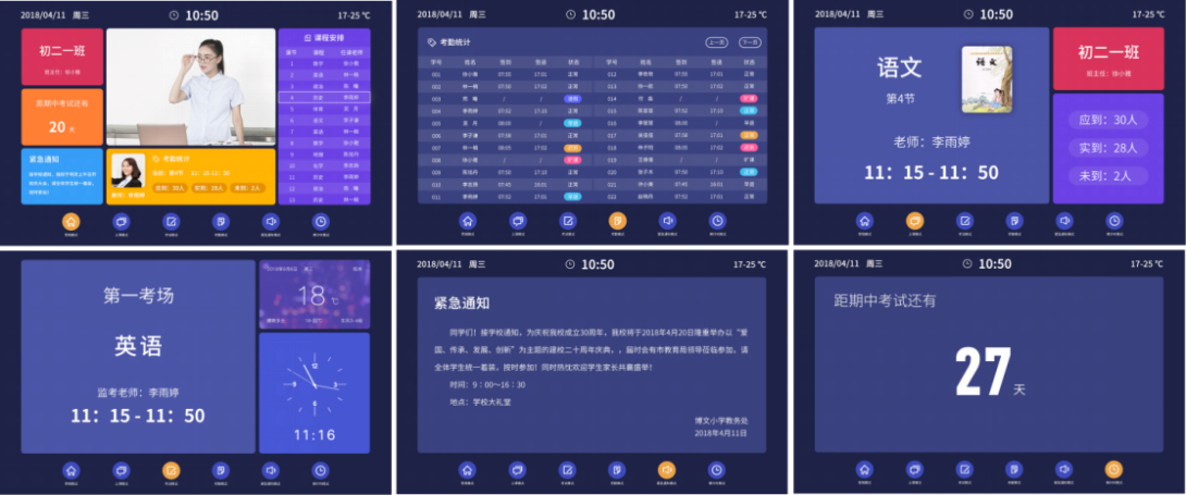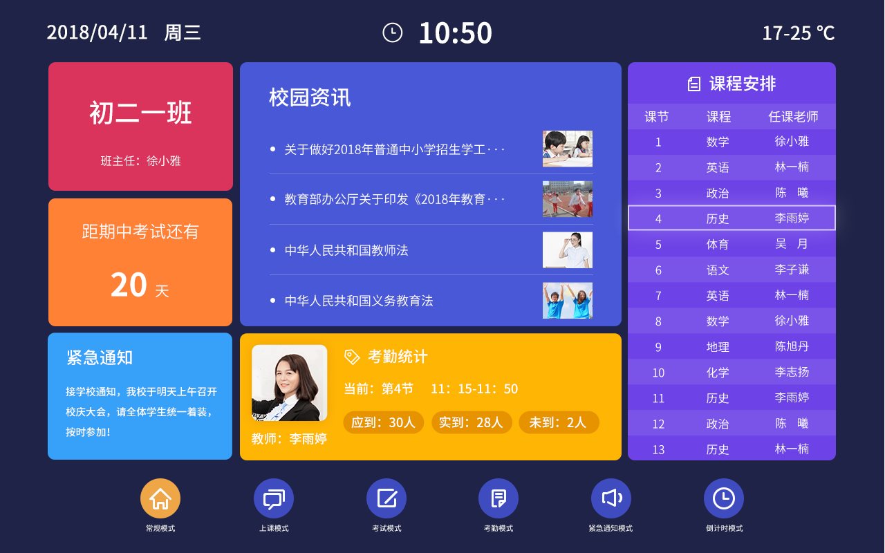 支持紧急通知模式、上课模式、考勤模式、常规模式、考试模式 ,倒计时模式 。