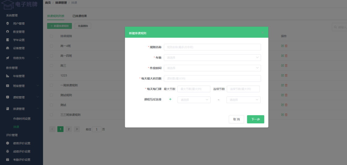 可自定义设置排课规则,如课程的基本信息、时间规则、辅助规则、互斥规则、学段、单双周和连排规则等。