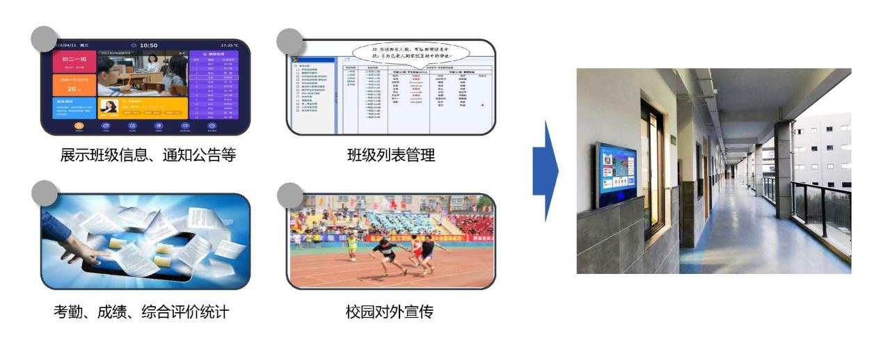在每个教室门口壁挂安装电子班牌终端,可以实现班级信息,当前课程信息,班级活动信息以及学校的通知信息显示。