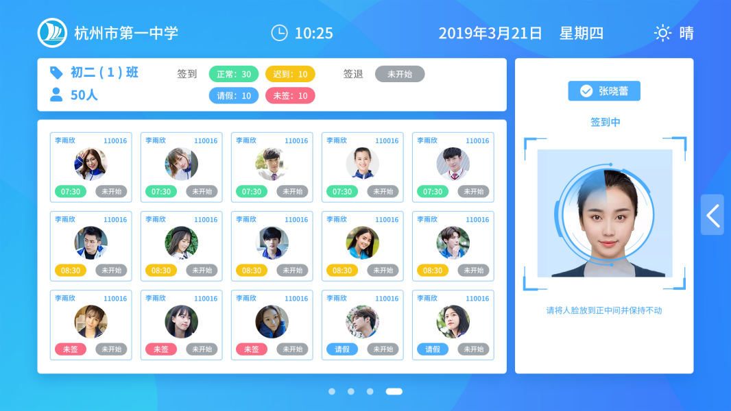 在电子班牌上添加签到的功能,学生可以在教室门口的班牌上刷卡、刷脸自助签到,班级考勤情况一目了然;同时,家长也能收到孩子的签到信息提醒。