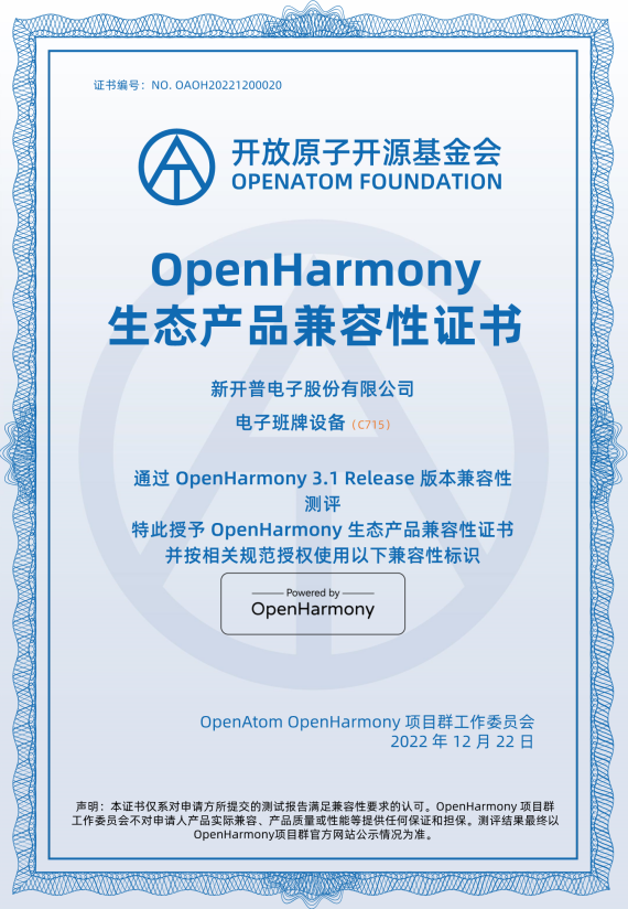 IT之家 1 月 17 日消息,据开源鸿蒙 OpenHarmony 消息,近日,由中软国际有限公司(以下简称“中软国际”)提供技术支持,新开普电子股份有限公司(以下简称“新开普”)推出的电子班牌顺利通过 OpenAtom OpenHarmony(以下简称“OpenHarmony”)3.1 Release 版本兼容性测评,获颁 OpenHarmony 生态产品兼容性证书。