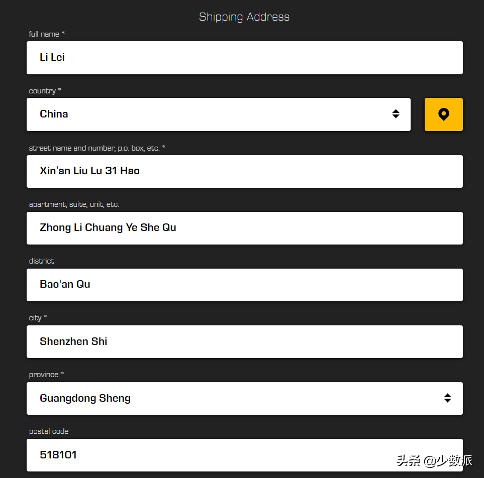 不要使用中文 。这是为了保证信件能够从 dbrand 的加拿大工厂顺利寄出,也不要使用地址输入框旁边的定位按钮(会定位出中文地址)。使用国内快递员能够辨识的拼音 。在满足第一点的条件下,越是简单直接粗暴的拼音越能帮助快递员正确投递你的贴纸。邮编很重要 。在国内快递公司揽件分件过程中,如果你的拼音因为地名特殊实在难以辨认,正确的邮编能够保证信件不至于流落外省。如果你觉得上面的叙述有些抽象,我们不妨举个例子。假设李雷的电话号码是 12345678901,收信地址是广东省深圳市宝安区新安六路 31 号众里创业社区,那么他在 dbrand 下单时地址可以这样填写: