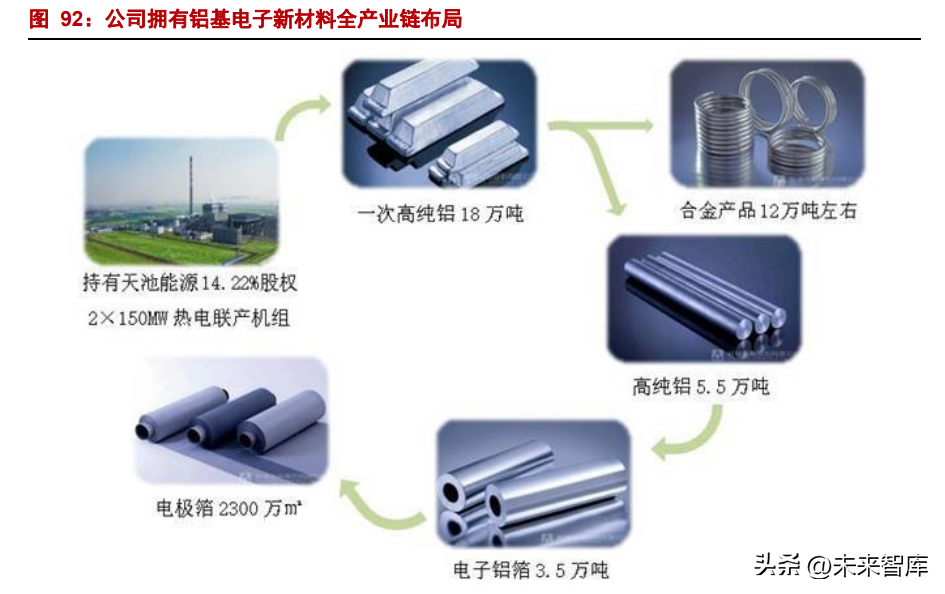 公司主要从事铝电子新材料和铝及合金制品的研发、生产和销售,主要产品包括高纯 铝、电子铝箔、电极箔、铝制品及合金产品,产品广泛应用于电子设备、家用电器、汽车 制造、电线电缆、交通运输及航空航天等领域。目前公司拥有产能包括:天池能源 14.22% 股权以及 2×150MW 热电联产机组、一次高纯铝 18 万吨、合金产品及铝制品 12 万吨、高 纯铝 5.5 万吨、电子铝箔 3.5 万吨、电极箔 2300 万平方米。