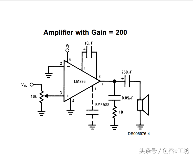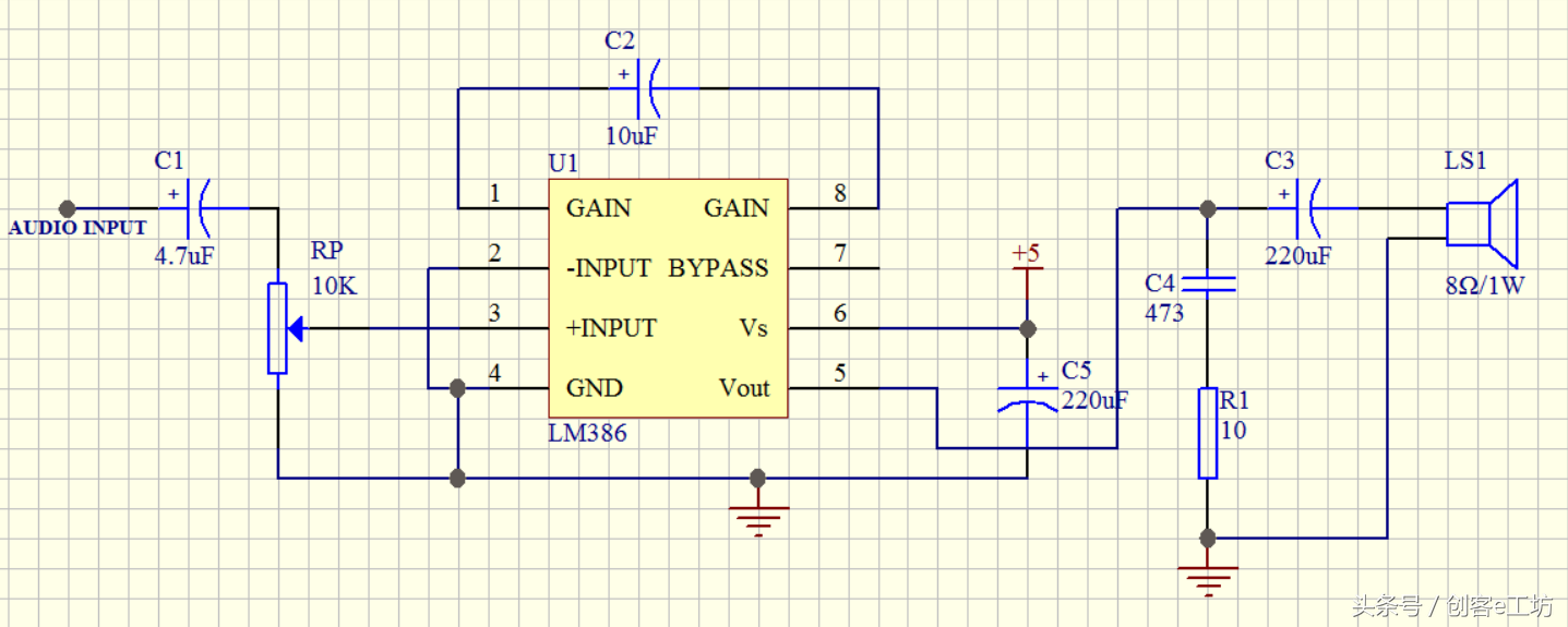 我们根据LM386的数据手册,选择其中的一个典型电路来做,电路图如下: