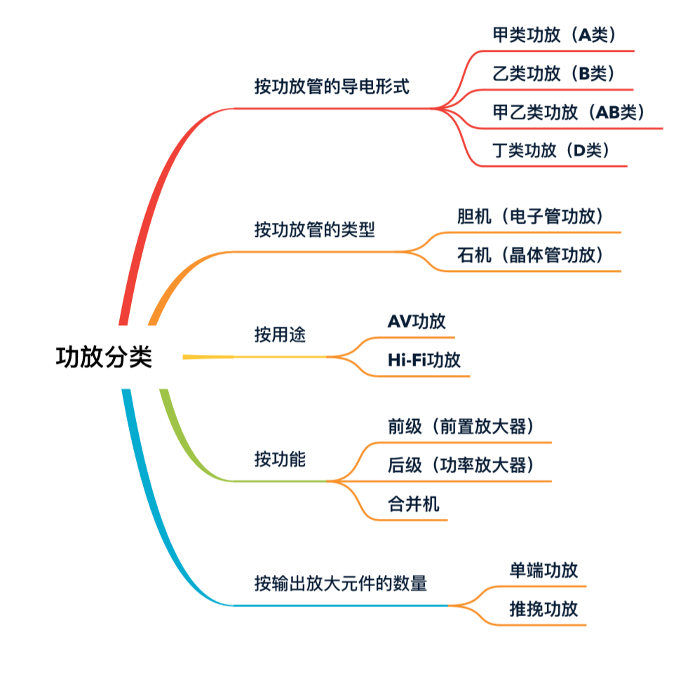对于功放的分类是很容易让人迷糊的,主要原因就是功放的分类标准太多,分类出来的功放又相互穿插,我在刚刚接触的时候总是搞混。今天我整理了一张图来对功放进行分类,希望能帮大家理清。