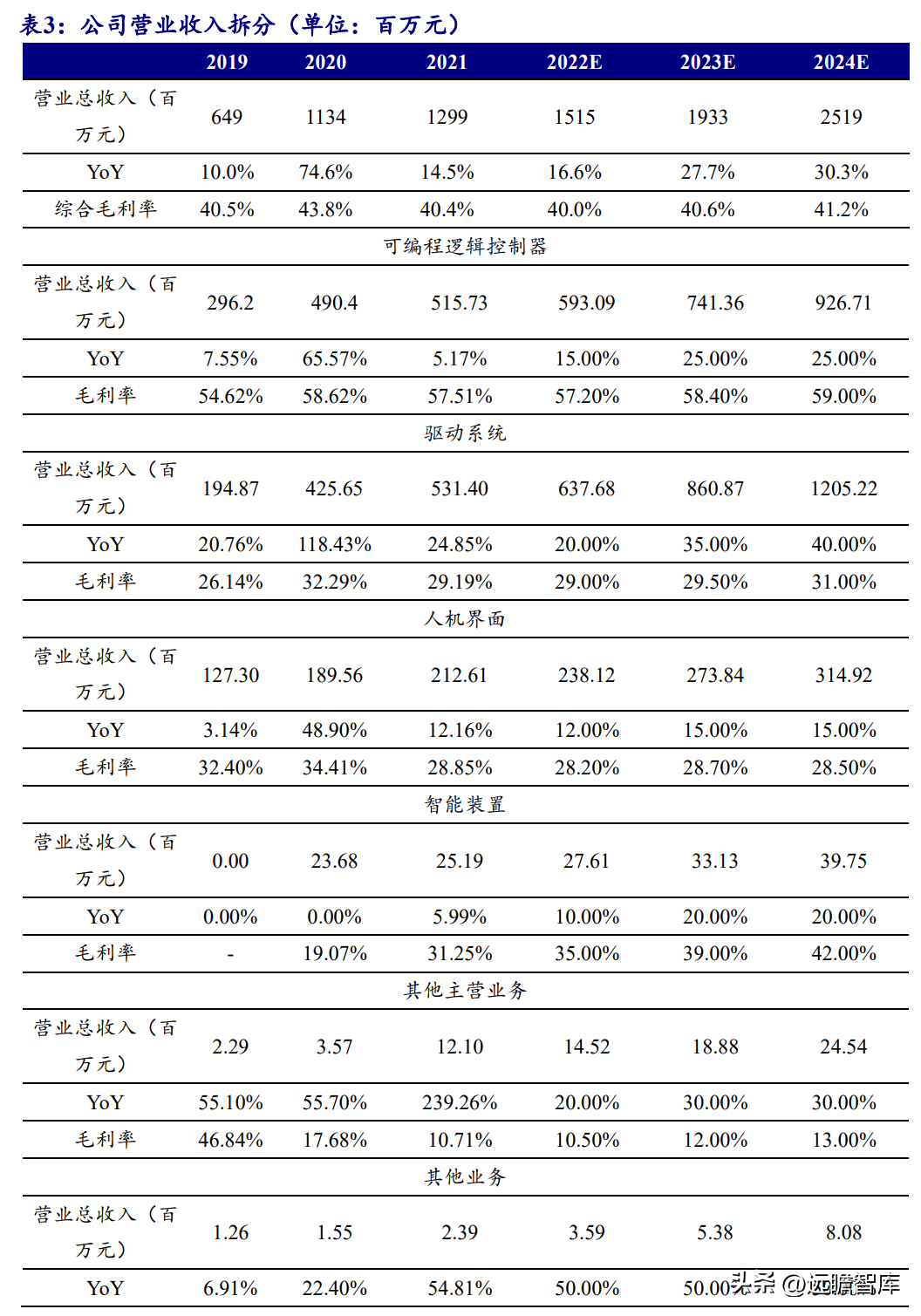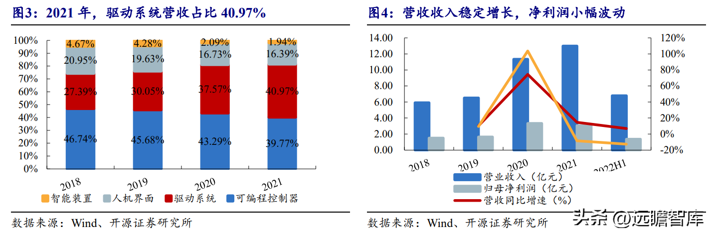我们预计公司 PLC 产品地位稳固、成长稳定,毛利率小幅提升;预计驱动系统业务、智能装置业务仍处于成长期。驱动系统业务2022年收入增速受疫情影响趋缓,2023-2024年可实现35%以上的增速,智能装置2023-2024年实现20%的增速。