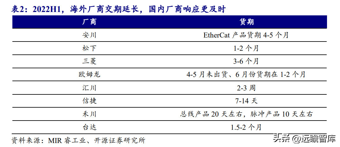 国产工控厂商供应链建设完善,需求响应及时。 2022Q2,在疫情和“缺芯”双重影响下,安川的伺服产品货期延长至3-5个月,三菱货期在3-6个月,施耐德货期在2-6个月以上。而国内厂商交期普遍在3周以内,其中信捷电气的货期仅7-14天。